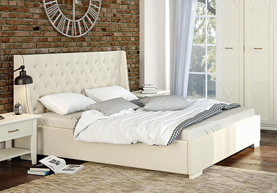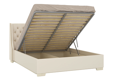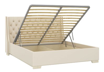 Двуспальная кровать с мягким изголовьем и подъемным механизмом является центральным элементом спальни, обеспечивает полноценный ночной отдых и отличается функциональностью. Главная особенность модели заключается в механизме, поднимающем верхнюю часть конструкции для открытия доступа к большому коробу для хранения.