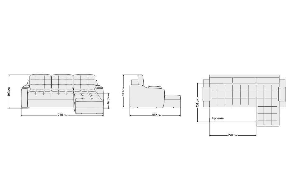 - Длинна по спинке оттоманки — 98 см, длина дивана — 172,5 см, итоговая длина — 270,5 см;