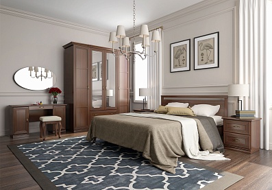 Застекленные шкафы-витрины с фрезерованными филенками позволят продемонстрировать гостям редкие издания, дорогой чайный сервиз или семейные фотографии, а LED-подсветка поможет подать ценные предметы в выгодном свете. Внутренние зеркальные стенки визуально увеличивают пространство. Изящные карнизы, стильная фурнитура в цвете «старая бронза», технология патинирования обеспечивают элегантный налет старины.