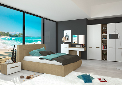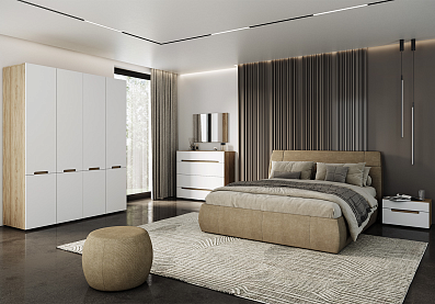 - Спальня в современном стиле. Такая мебель универсальна и подойдет интерьерам в стилях эко, скандинавский, минимализм или лофт;