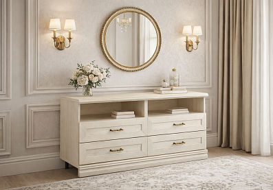 Крайние секции — выдвижные ящики, средняя секция с 2 отделениями по высоте: верхнее отделение — открытая ниша, нижнее отделение с выдвижным ящиком, с рамочной конструкцией фасада;