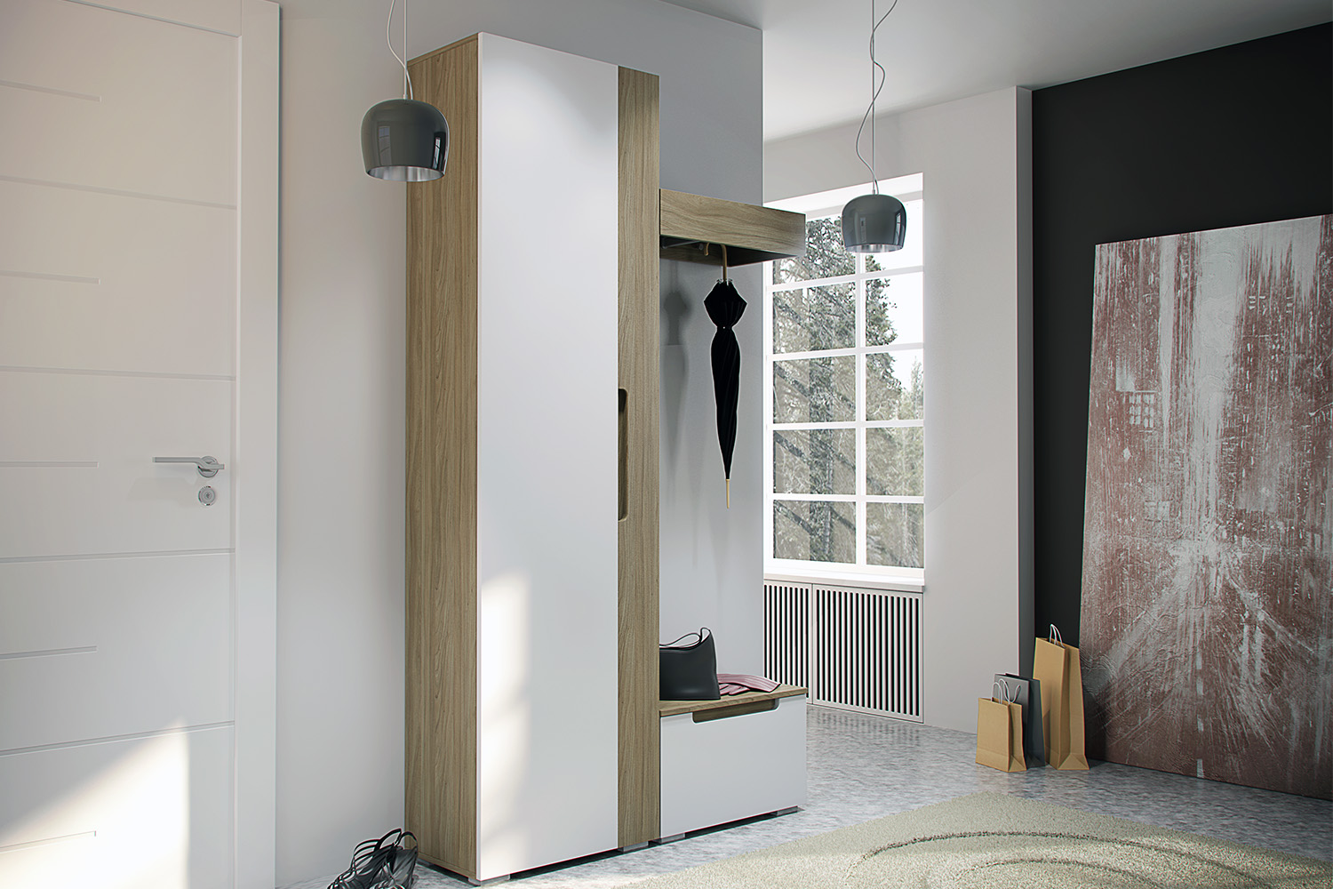 Прочные фасады из МДФ в ПВХ-пленке текстурированы под дерево «швейцарский вяз» и украшены вставкой базового белого цвета. Такое оформление зрительно вытягивает помещение в вертикальном направлении. Все детали облицованы кромочным материалом высокого качества, защищающим древесную плиту от порчи и расслоения. Внутри одностворчатый шкаф укомплектован евроштангой и двумя полками, по запросу покупателя могут быть установлены 4 полочки из ламинированной ДСП. В комплектацию входят крепеж и фурнитура.