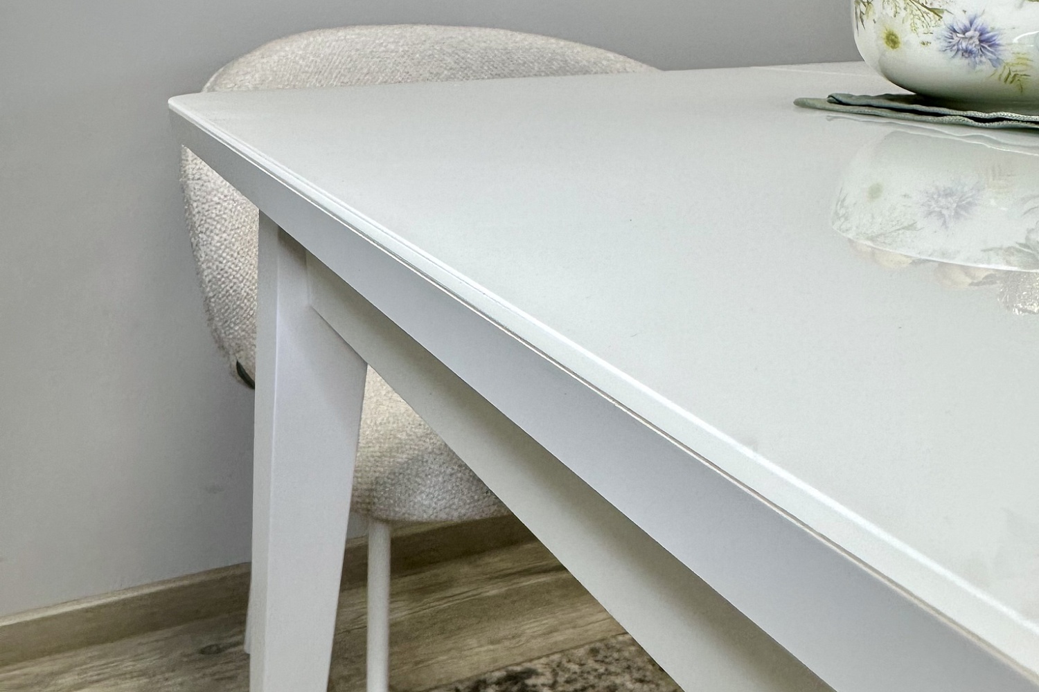 Столешница из стекла надежно защищает стол от влаги и горячего. Для данного стола применяется дорогое, просветленное стекло optiwhite которое передает чистый, яркий цвет без зеленого бутылочного оттенка. Стекло надежно крепится к подложке из ЛДСП на герметик, распределенный по всей поверхности столешницы.