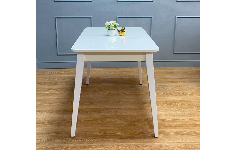 Столешница из стекла надежно защищает стол от влаги и горячего. Для данного стола применяется дорогое, просветленное стекло optiwhite которое передает чистый, яркий цвет без зеленого бутылочного оттенка. Стекло надежно крепится к подложке из ЛДСП на герметик, распределенный по всей поверхности столешницы.