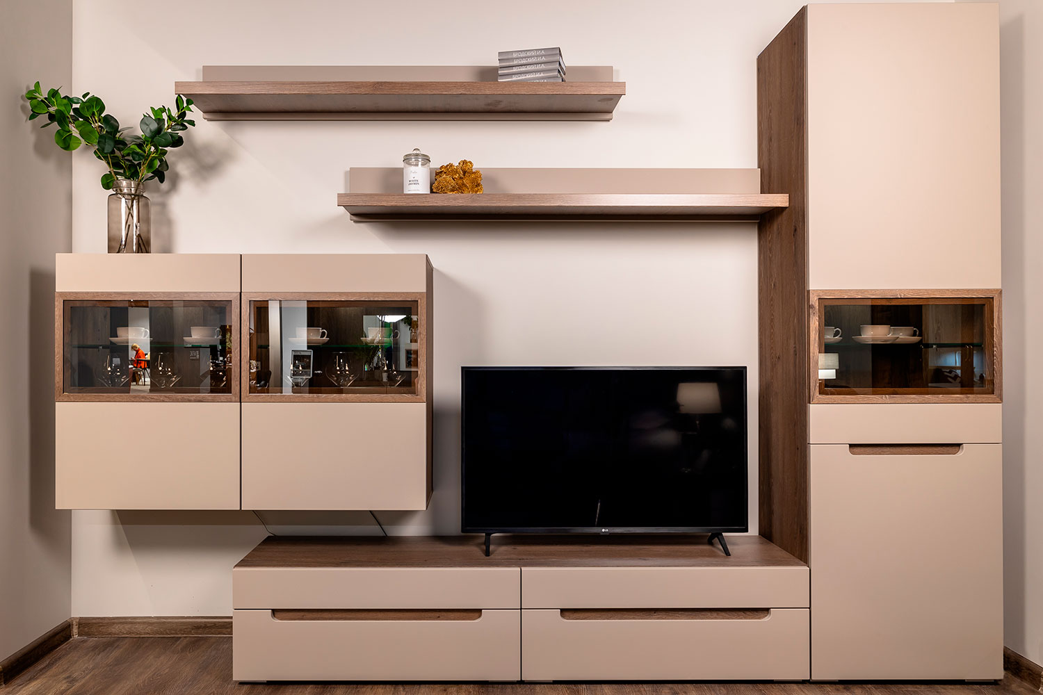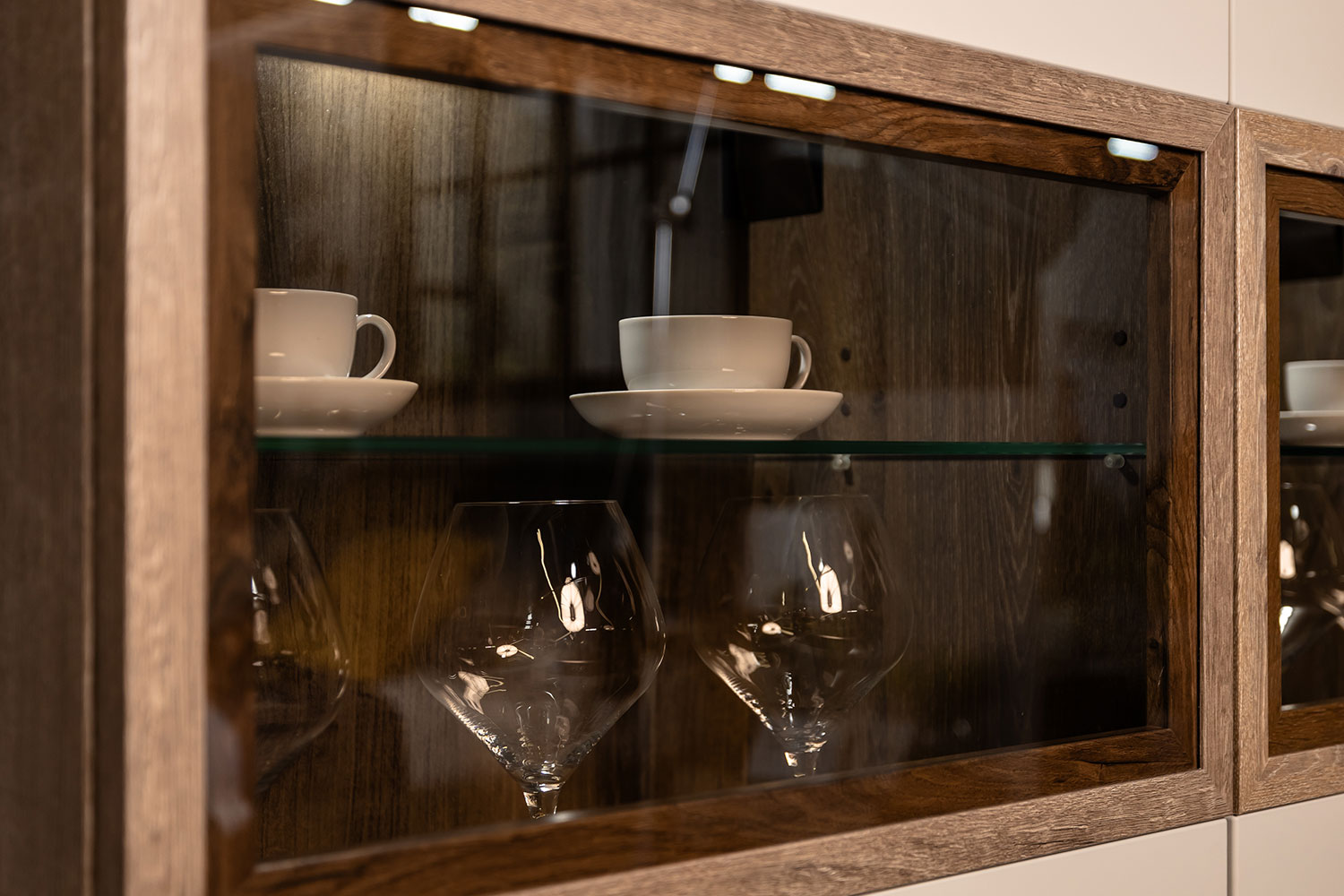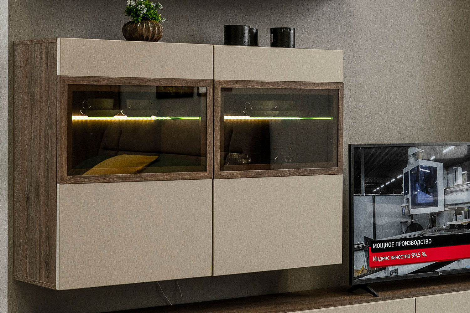 - Фасад: профиль МДФ в пленке ПВХ, вставка — стекло Stopsol бронза;